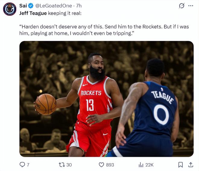杰夫-蒂格在个人播客节目中说道:哈登不该在快船遭受这一切,把他送回休斯顿火箭队吧。
