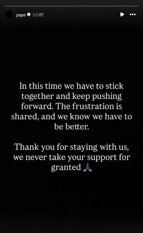 帕普-萨尔写道:“在现在这个时候,我们需要团结在一起,继续推动我们前进,我们都很沮丧,我们知道自己需要做得更好。感谢你们一直陪伴着我们,我们从来不认为你们的支持是理所应当的。”